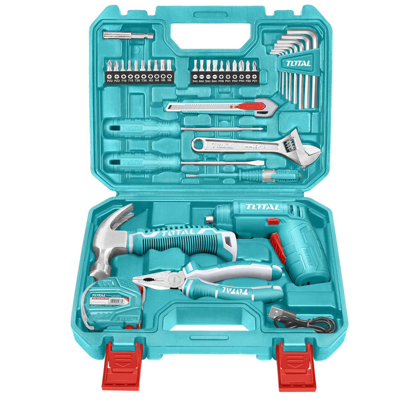 Komplet vključuje tudi kabel za USB polnjenje, izvijače, 20 nastavkov, kombinirane klešče, kladivo, 3-metrski merilni trak, nastavljiv ključ, tokovni tester, magnetni držalo bitov, nož s snemljivim rezilom in komplet inbus ključev.
