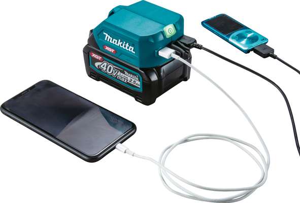 - Makita ADP001G je priročen USB adapter, zasnovan za uporabo z 40 V XGT Li-ion akumulatorji, ki omogoča polnjenje dveh mobilnih naprav hkrati.