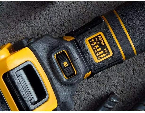 - Regulacija hitrosti kotnega brusilnika Dewalt DCG409VSN je 6-stopenjski gumb, ki vam omogoča nastavitev hitrosti od 3000 do 9000 vrtljajev na minuto.
