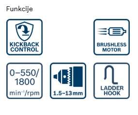 - Najboljše funkcije za upravljanje orodja: napredna tehnologija KickBack Control zmanjšuje nevarnost rotacijskega povratnega udarca