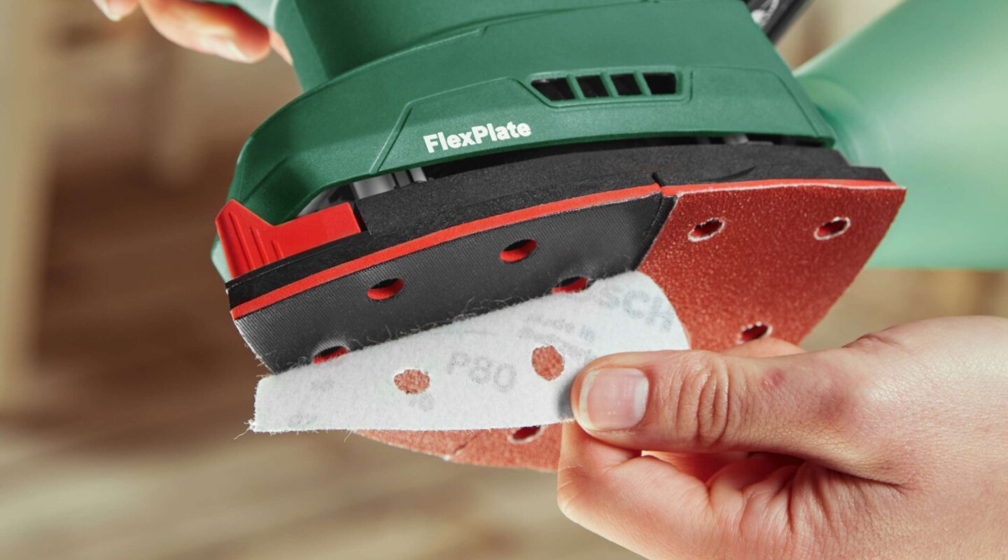 Akumulatorski večnamenski brusilnik z različnimi brusilnimi ploščami in nadzorom števila vrtljajev.