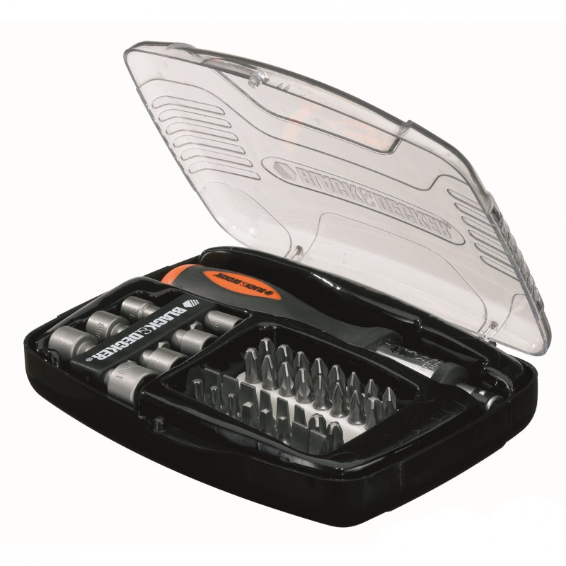 Priložena: 40-delna garnitura vijačnih nastavkov in natičnih ključev Black+Decker A7062 je zelo praktična, saj imate z njo pribor in izbor različnih nastavkov vedno pri roki.