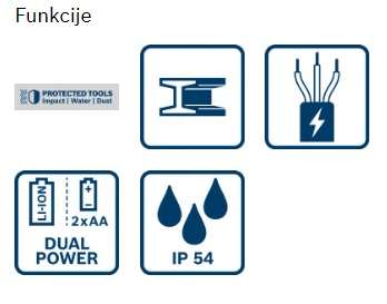 - Zasnovan je za delo na zahtevnih deloviščih zaradi gumijastega ohišja, ki blaži udarce, in zaščite IP54.