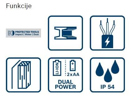 - Zagotavlja zanesljivost z zaznavanjem kovin, žic pod napetostjo in lesenih tramov za steno.