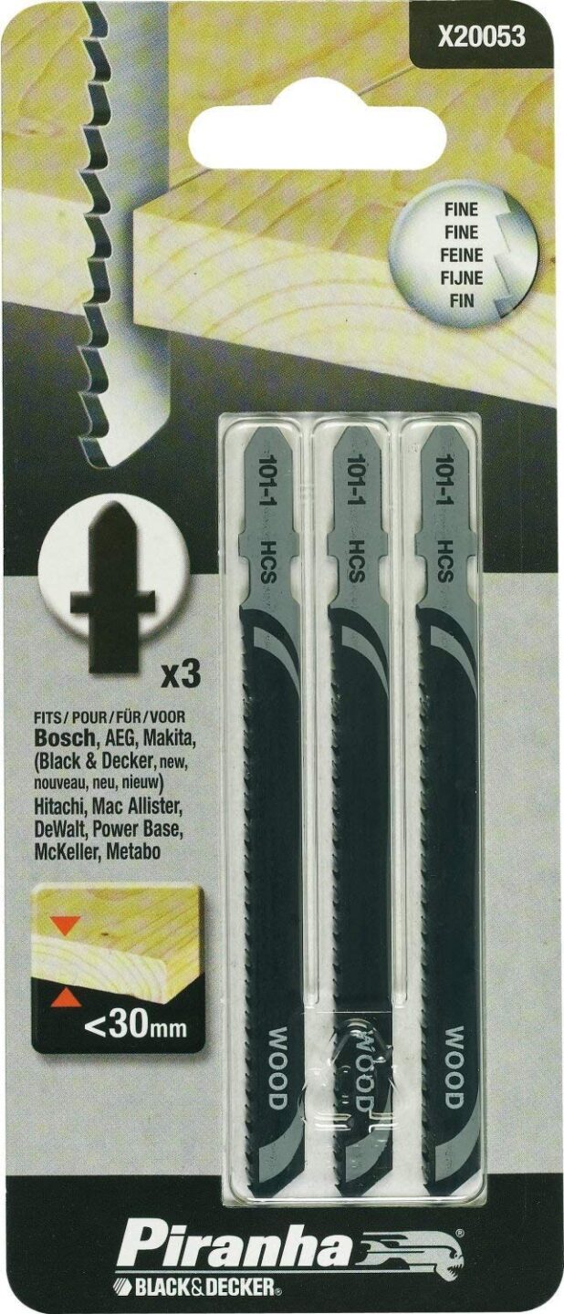 3 listi za vbodno žago s T vpetjem; fini – HCS: karbon, oblikovan za rezanje mehkejših materialov, mehkejšega lesa in plastike.