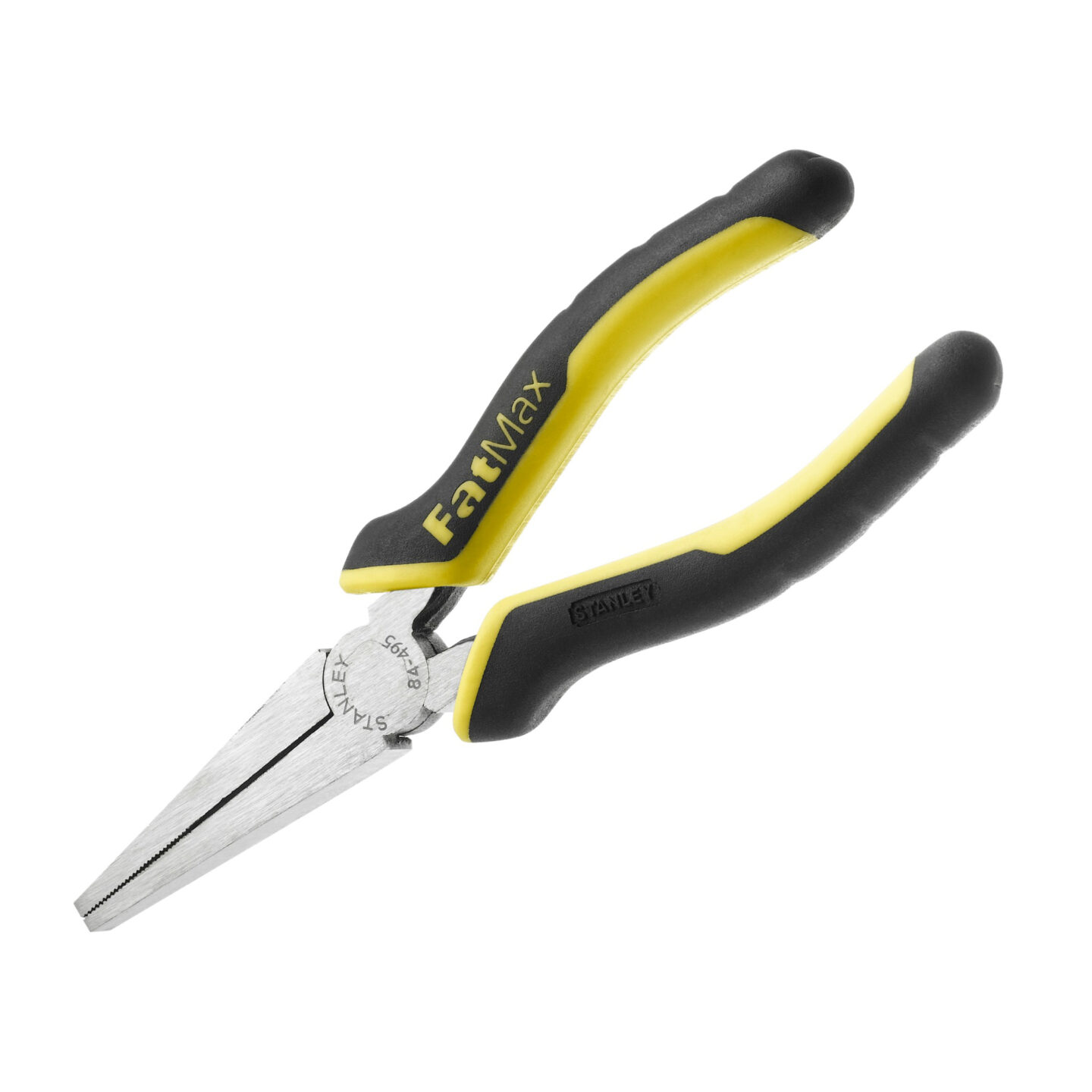Ploščate koničaste 150 mm klešče Stanley 0-84-495 z ročajem iz dveh materialov (guma in plastika) s površinskimi žlebovi za bolj trden oprijem.