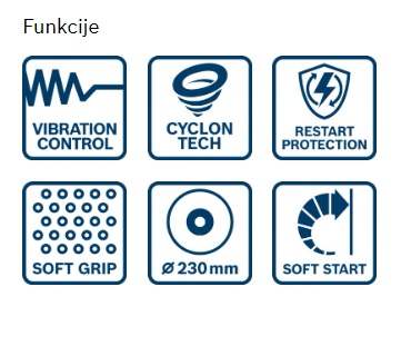Zmogljiv kotni brusilnik z močjo 2400 W in sistem za zaščito pred prahom CYCLON TECH za daljše delovanje.