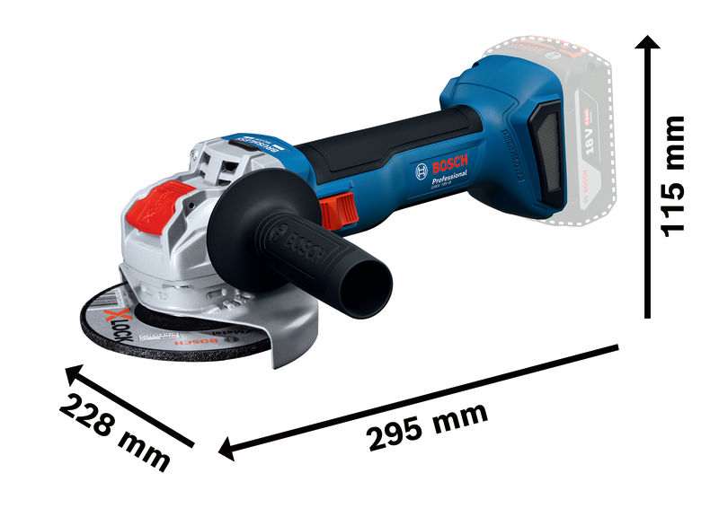 - Kotni brusilnik GWX 18V-8 zagotavlja moč, enakovredno 800 W moči pri kabelskem priklopu.