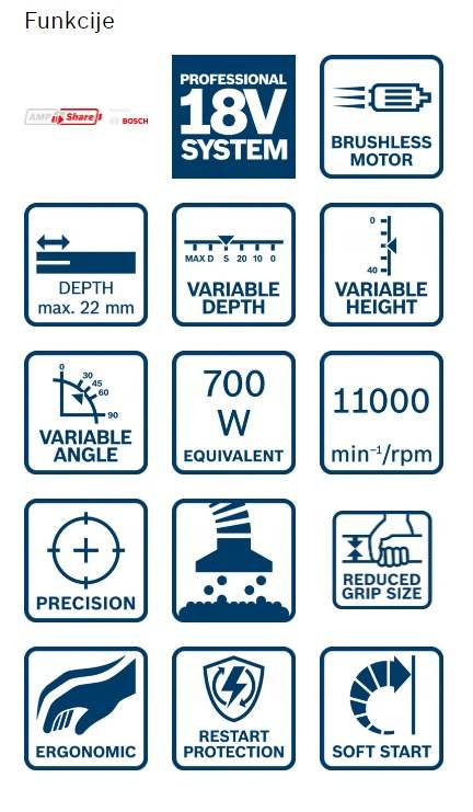 - Priročno in natančno zaradi brezstopenjske nastavitve globine, višine in kota reza, funkcije za gladke potopne reze, aluminijastih kotnih vodil in oznake položaja reza.