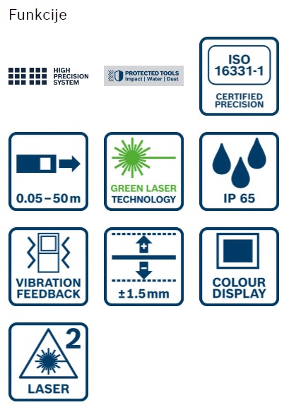 - Hitrejše in lažje ciljanje pri merjenju na dolge razdalje v zaprtih prostorih zaradi zelenega laserskega žarka.