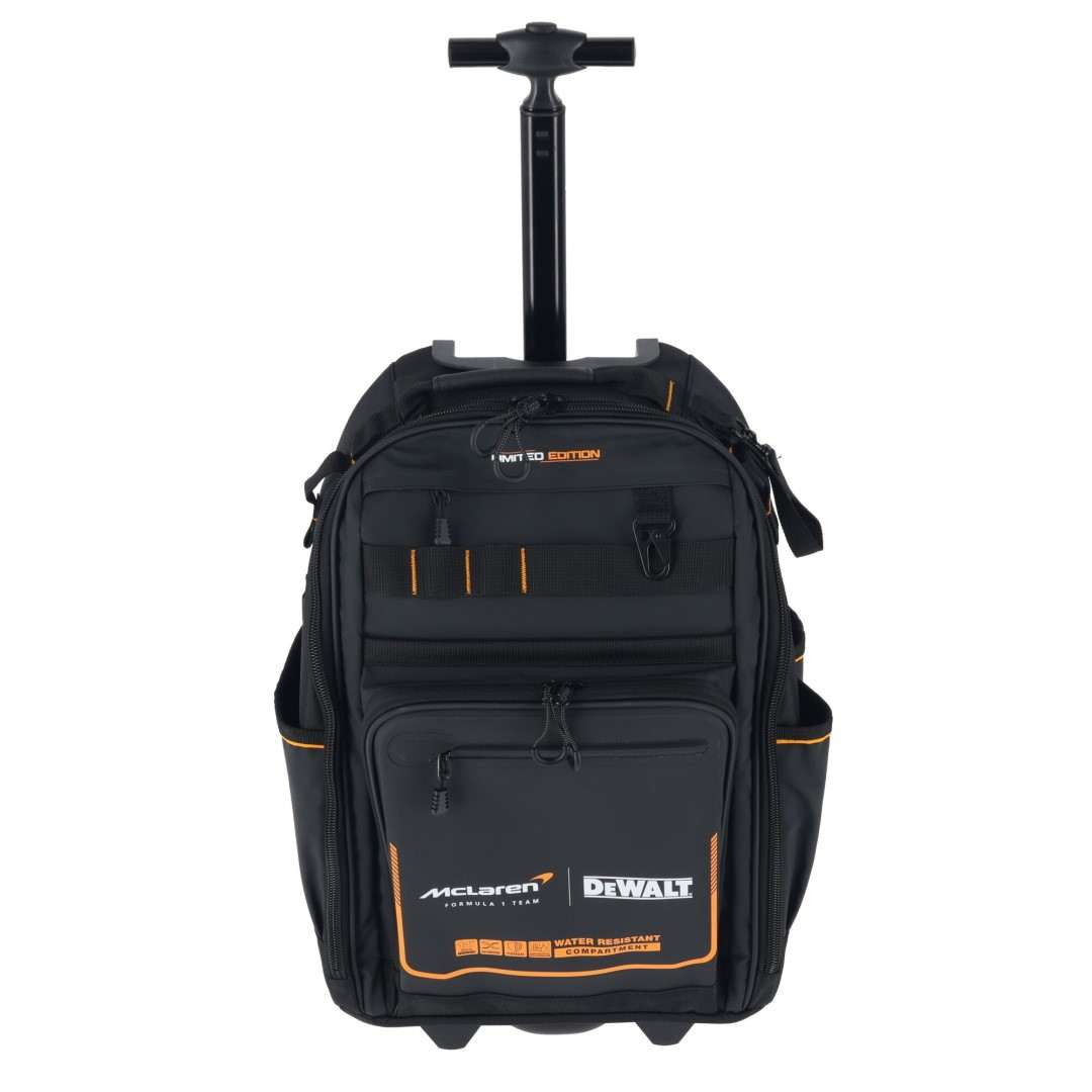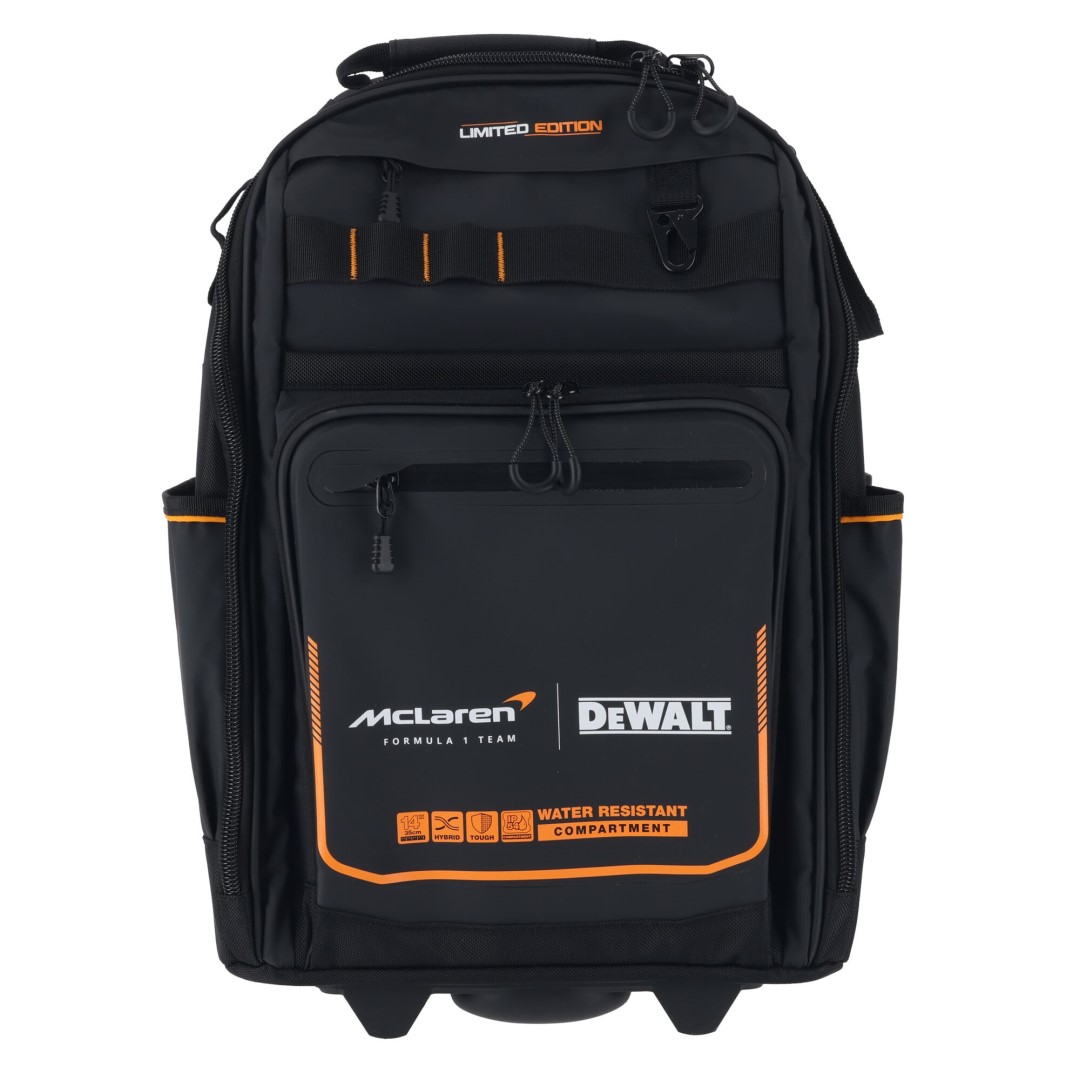 - Ekskluzivni DEWALT x McLaren F1 Team nahrbtnik združuje vrhunsko vzdržljivost, premišljeno ergonomijo in športni dizajn, ki je ustvarjen za profesionalce, ki delajo v hitrem, zahtevnem okolju.