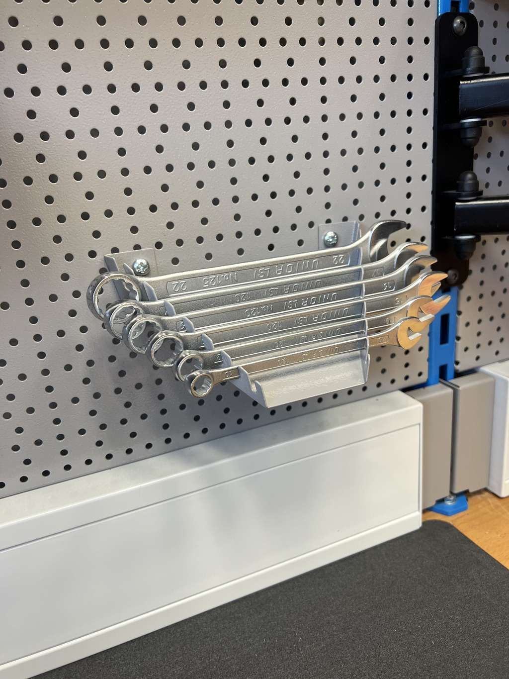 - Na nosilec je mogoče namestiti do osem viličastih ali viličasto obročnih ključev velikosti do 24 mm, kar uporabniku omogoča učinkovito organizacijo najpogosteje uporabljenih ključev.