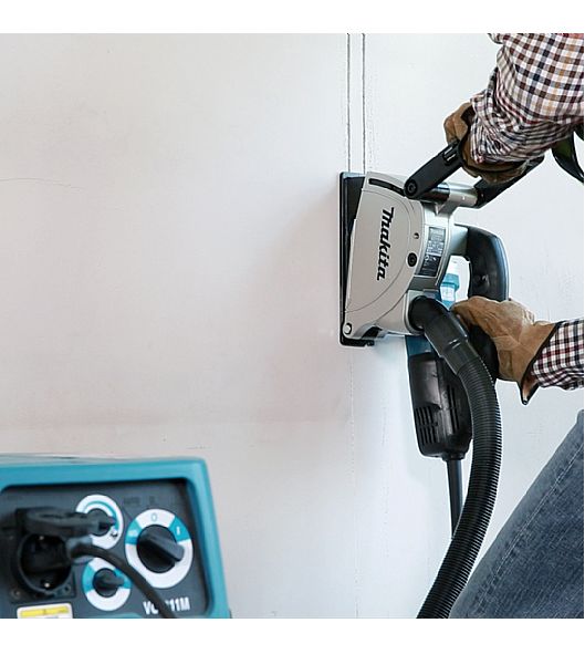 - Ustrezno nameščen sprednji pokrov učinkovito preprečuje širjenje prahu pri vseh globinah rezanja.