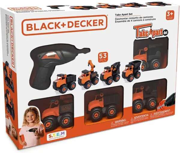 Ta komplet 4 razstavljivih tovornjakov Black+Decker je odlična izbira za otroke, ki obožujejo gradbena vozila in sestavljanje! Priložen baterijski vijačnik, prilagojen majhnim rokam, omogoča enostavno sestavljanje in razstavljanje vozil, kar spodbuja učenje skozi igro.