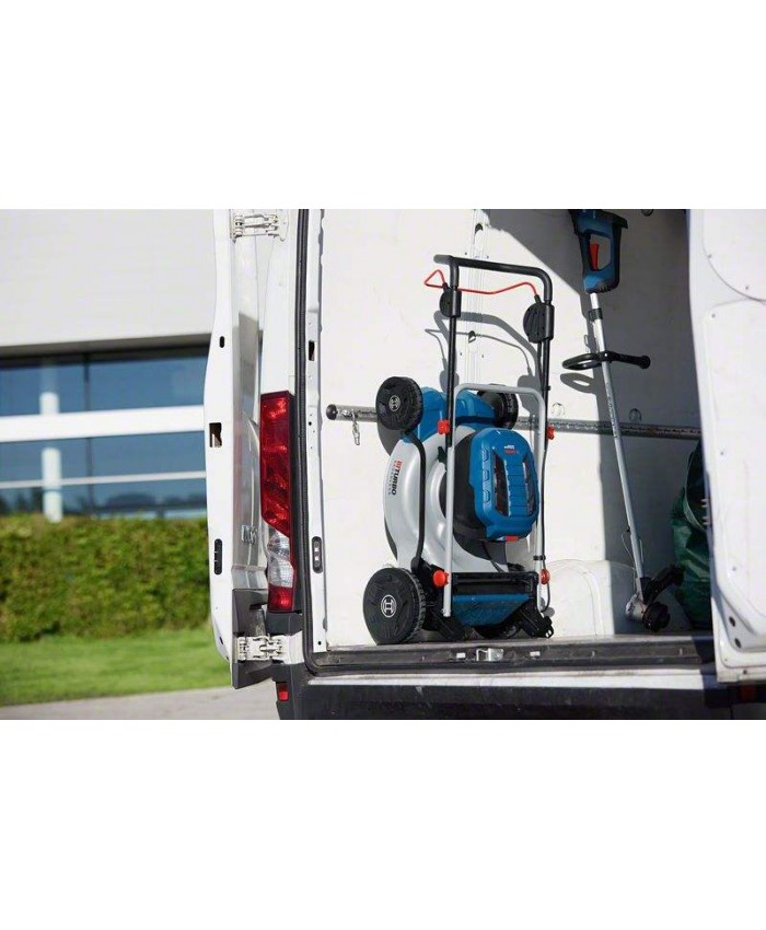 - Zložljivi ročaj omogoča kompaktno prenašanje in shranjevanje kosilnice, tudi v navpičnem položaju.