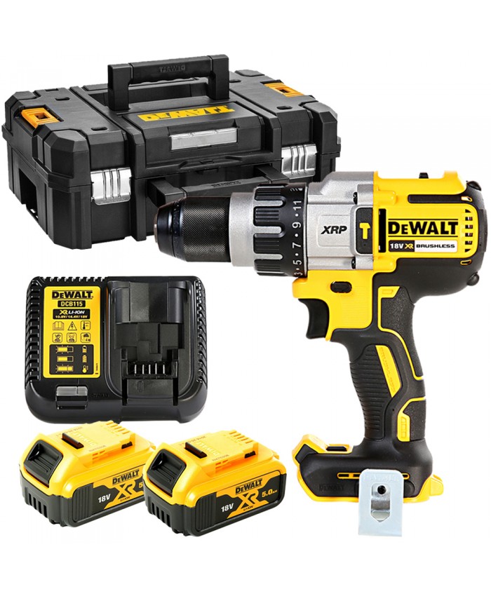 V opremi DCD996P3: 3x akumulator 18 V 5.0 Ah Li-Ion, XR večnapetostni polnilec, zaponka za pas, magnetno držalo nastavkov, večpozicijski stranski ročaj, trpežen kovček TSTAK.