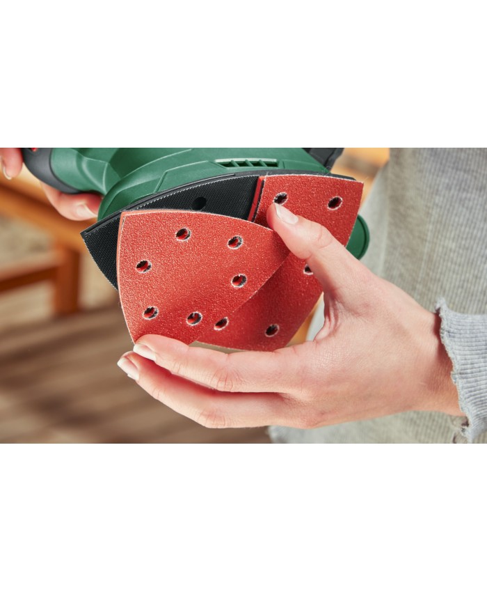 - Optimalno brušenje trdega in mehkega lesa, lakiranih in barvanih površin ter robov in vogalov.