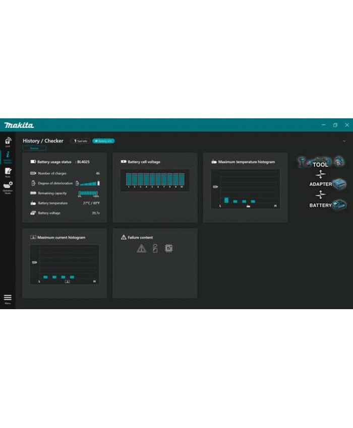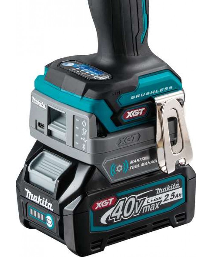 - Adapter omogoča spremljanje delovanja akumulatorja, posodabljanje programske opreme in komunikacijo z Makita aplikacijo, kar pripomore k boljšemu nadzoru in optimizaciji delovanja orodij XGT.