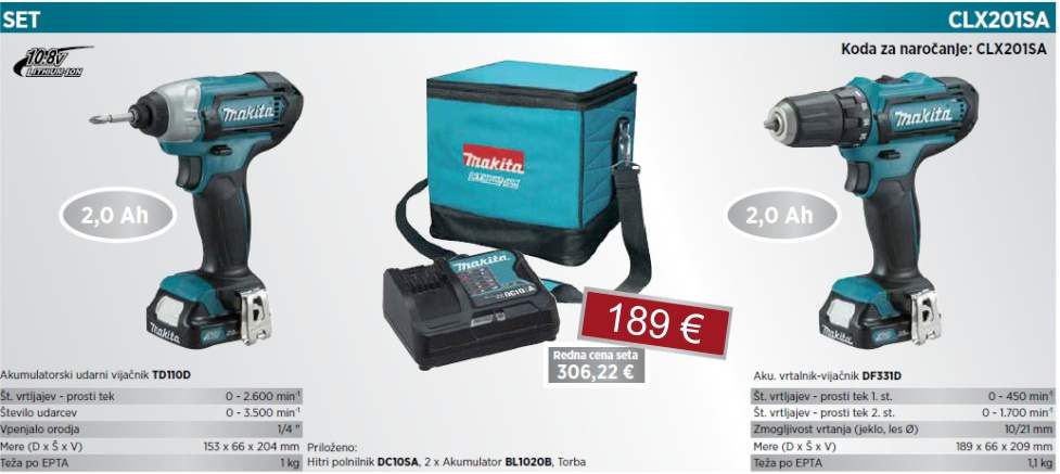 Priporočamo set Makita CLX201SA, ki je tudi najbolje prodajan set baterijskega orodja v naši spletni trgovini.