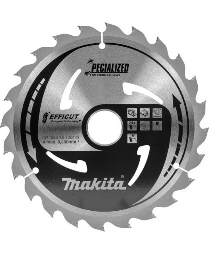 - Makita Efficut TCT žagin list serije E-12170 je vrhunski rezalni pripomoček, zasnovan za natančno in hitro rezanje lesenih kompozitov, kot je WPC (Wood Plastic Composite).
