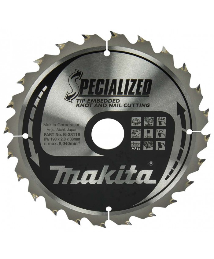 - TCT Specialized žagin list za les 190 mm 24 zob Makita B-33118 je zasnovan posebej za zahtevnejše pogoje rezanja, kjer lahko v materialu naletimo tudi na žeblje.