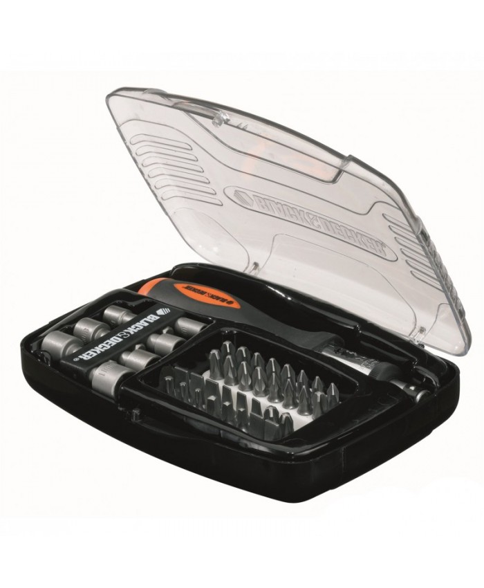 Priložena: 40-delna garnitura vijačnih nastavkov in natičnih ključev Black+Decker A7062 je zelo praktična, saj imate z njo pribor in izbor različnih nastavkov vedno pri roki.
