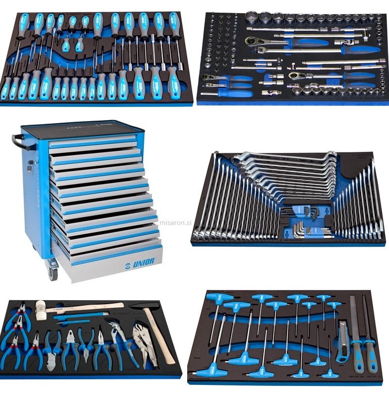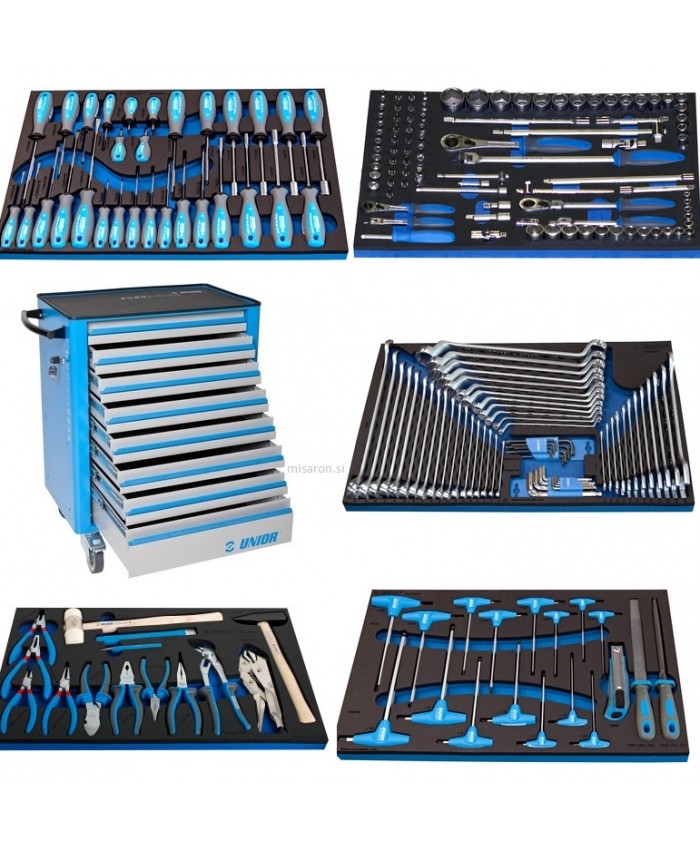 Garnitura 940EV26 je sestavljena iz skupno 219 kosov orodja. Ob vozičku Unior 940EV6 prejmete 5 garnitur: