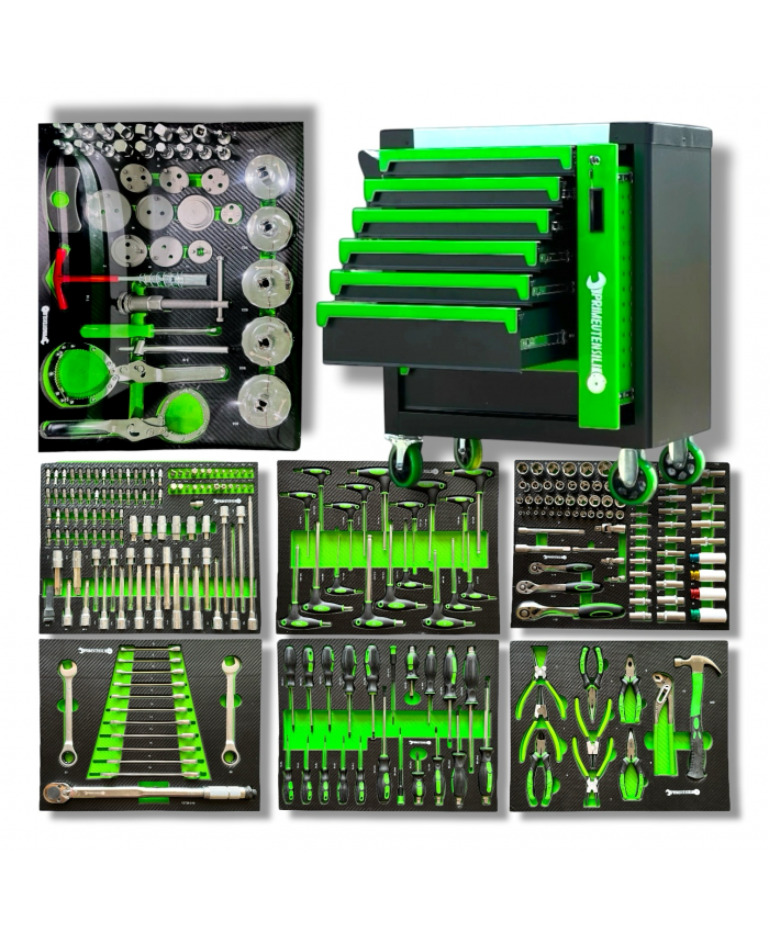 - Opremljen je z osmimi prostornimi predali, od katerih je kar sedem popolnoma napolnjenih s kakovostnim orodjem iz krom-vanadijevega jekla, razporejenim v termoformirane vložke za pregledno in varno shranjevanje.